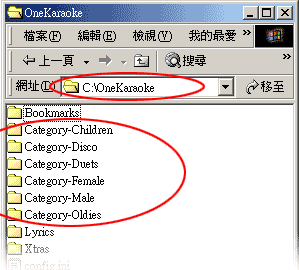 The content (mpg, avi, wmv, etc.) should be placed in respective folders named as Category-XXXX as in the above. On launching, OneKaraoke will