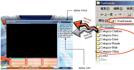 In the above example, there are six song categories defined by user: - Male, Female, Duets, Oldies, Children, Disco ( In another instance, user may define these as Madonna, Westlife, Phil Collins, Elton John, etc. The nomenclature is entirely up to you!). So how is this categorization represented in the hard disk in relation to the karaoke files? The secret lies in the folder installed as C:\OneKaraoke\, where any folder named as Category-XXXX is automatically known to OneKaraoke as the song categories. These folders are stored in the directory C:\OneKaraoke\ as in the Right-hand Diagram above.